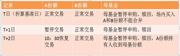 对于在交易所交易的A、B份额子基金来说,只能以交易价格成交,不能以净值赎回,这时就需要定期折算这样的机制来部分实现A份额的投资收益。定期折算是指:在每一个计息周期结束后(通常为一年),将A份额的约定收益(即大于1元的部分)折算为母份额,投资者可以通过赎回母份额来实现收益。发生定折时,套利的投资需要注意的是,折算基准日当天A份额和B份额是正常交易的,但是母基当天不能申购和赎回,所以,当天买入A份额和B份额是无法合并做折价套利的: