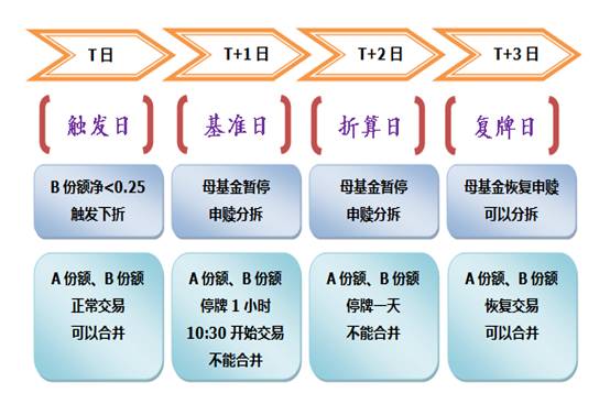 到点向下折算是指:与上折正好相反,下折是当B份额的净值下跌到某个价格时(比如0.25元),为了保护A份额持有人利益,基金公司按照合同约定对分级基金进行向下折算,折算完成后,A份额和B份额的净值重新回归初始净值1,A份额持有人将获得母基份额,B份额持有人的份额将按照一定比例缩减。下折之前基金公司都会发布提示公告。当发生下折时,折算基准日A份额和B份额是10:30开始交易,当日虽然可以同时买入A份额和B份额,但由于当日母基暂停申赎,因此,即使买入A份额和B份额,当日是无法合并的。分级基金下折的流程如图: