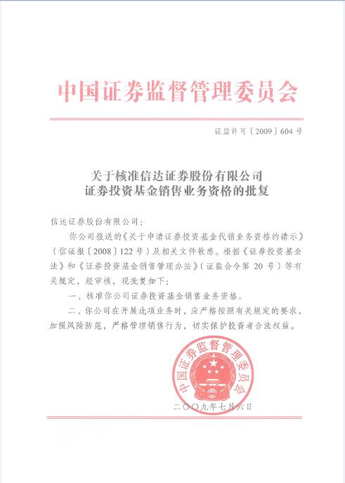 关于核准信达证券股份有限公司基金销售业务资格的批复