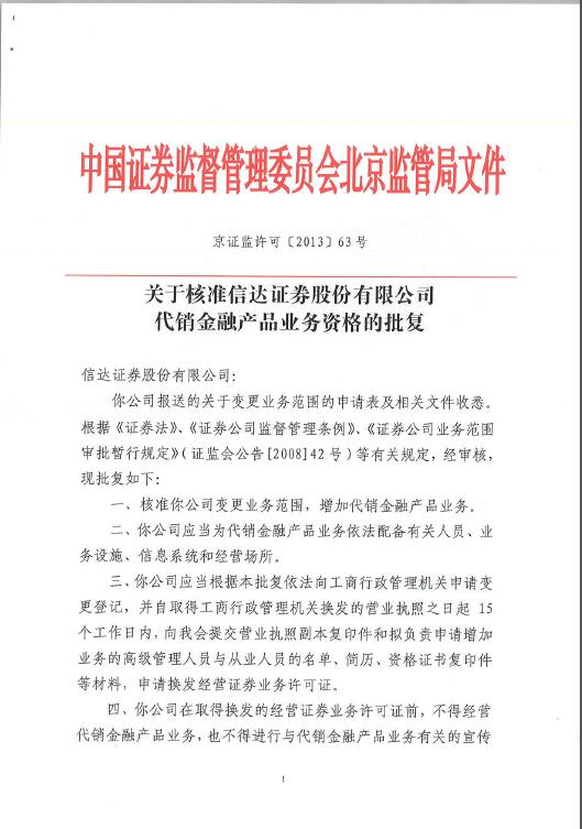 关于核准信达证券股份有限公司代销金融产品业务资格的批复