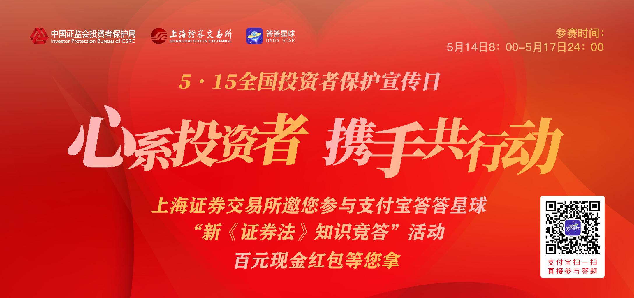 1.参与规则:活动时间内用支付宝扫描海报信达证券专属二维码,参与“5·15新证券法知识竞答活动”专场答题挑战。
