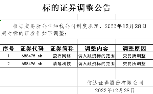 标的证券调整公告(2022-12-28)