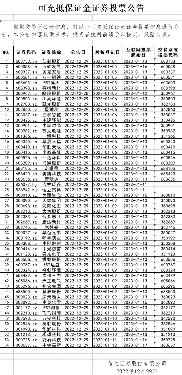 可充抵保证金证券投票信息(2022-12-29)