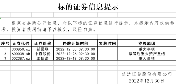标的证券信息提示(2022-12-30)