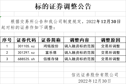 标的证券调整公告(2022-12-30)