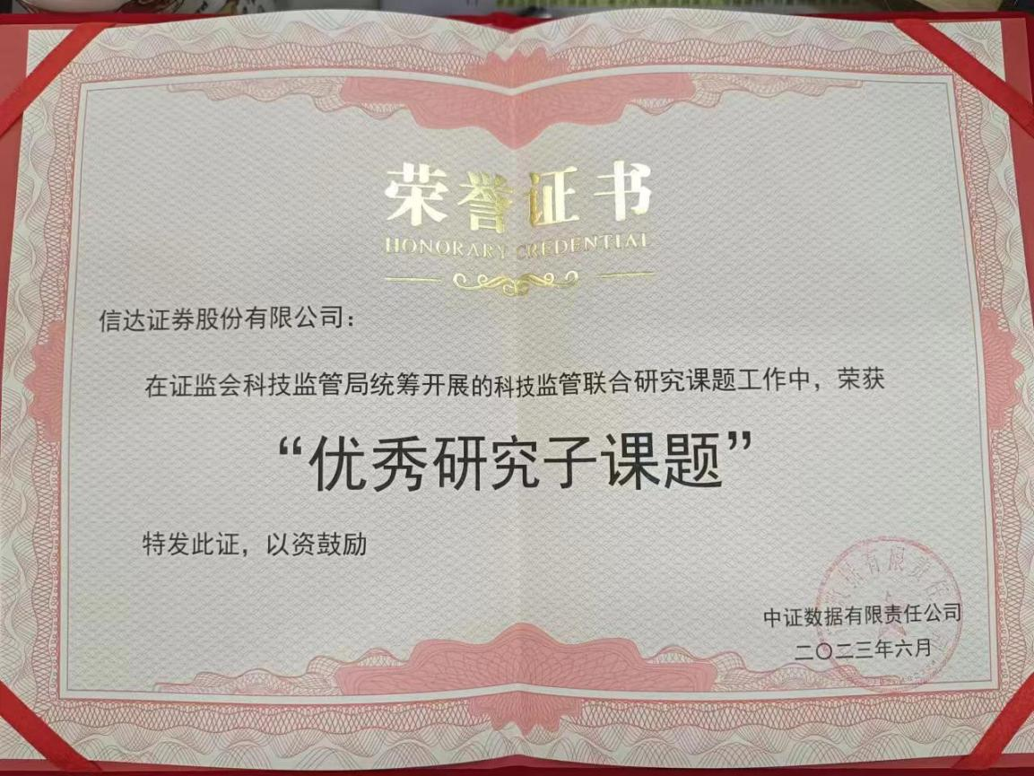 2022年7月,中证数据有限责任公司举办了“科技监管联合研究课题”评选活动。信达证券组成专项课题组,围绕券商集合资管产品的业务流程,总结了科技监管的数据结构模型,高效完成了《券商资管生命周期中的科技监管》课题申报书,该课题从券商资管产品生命周期的角度切入,展现了信达证券资产管理业务与科技监管的有效结合,获评中证数据有限责任公司“科技监管联合研究优秀研究子课题“奖项。
