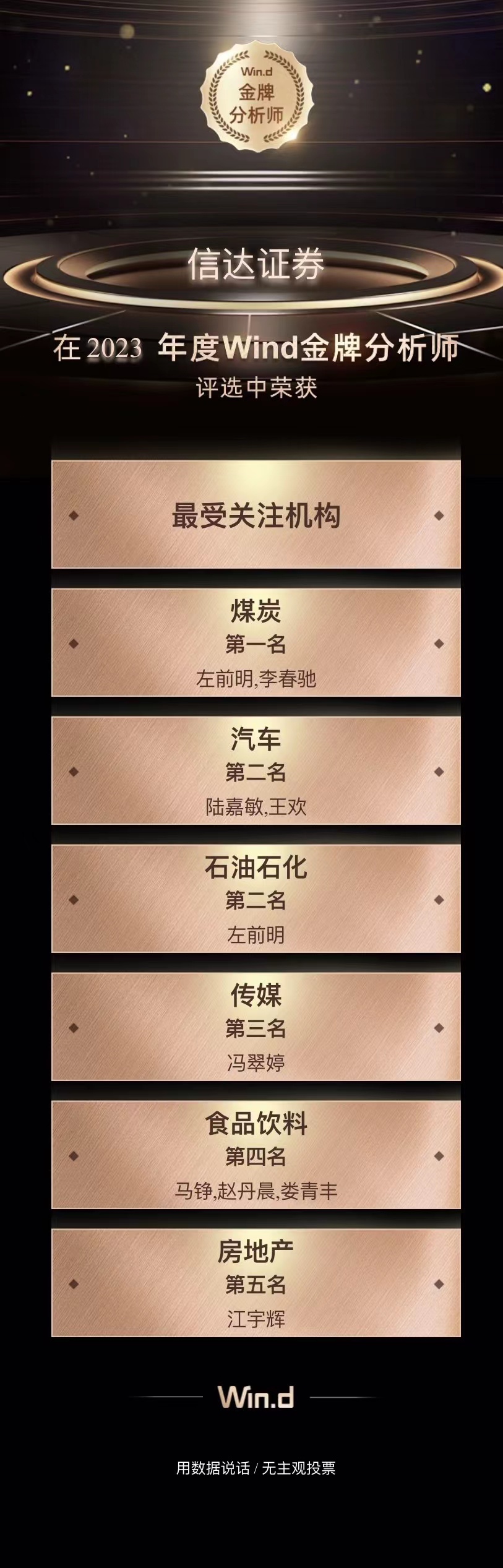 11月20日,2023年第十一届Wind“金牌分析师”评选结果正式揭晓。信达证券在评选中荣获“最受关注机构”奖;在煤炭、汽车、石油石化、传媒、食品饮料、房地产等6个领域斩获“研究领域单项奖”。