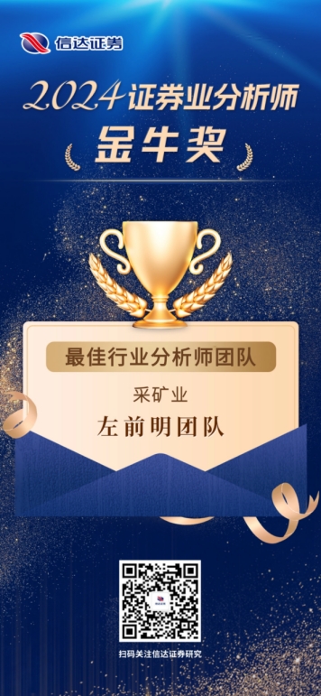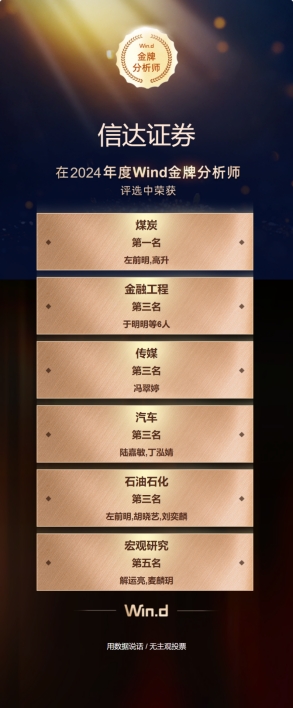 近期,2024年第十二届Wind“金牌分析师”评选结果及2024证券业分析师金牛奖评选结果正式揭晓。凭借出色的专业投研能力和优质的客户陪伴服务,信达证券研究团队在煤炭、金融工程、传媒、汽车、石油石化、宏观研究、采矿业领域荣获多项荣誉。
